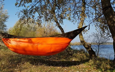 - Kiinnitä kuminauhat karabiineihin, joilla riippumattosi on kiinni puunhalaajissa, whoopieslingeistä tai muusta kiinnityspisteestä.